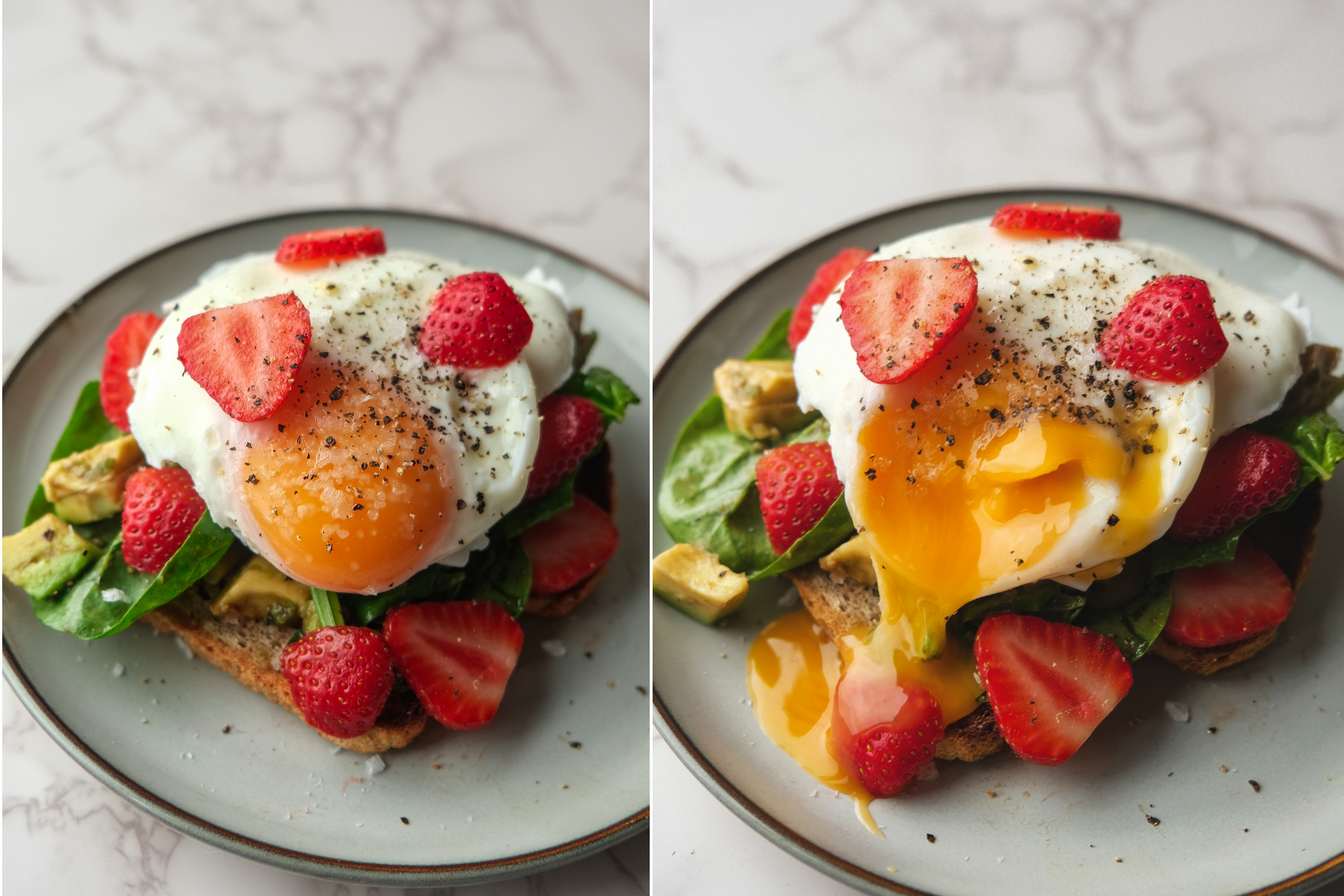 Rub your toast with a peeled garlic clove (don’t use the whole thing), then top with your strawberry, avocado and spinach, and your eggs.